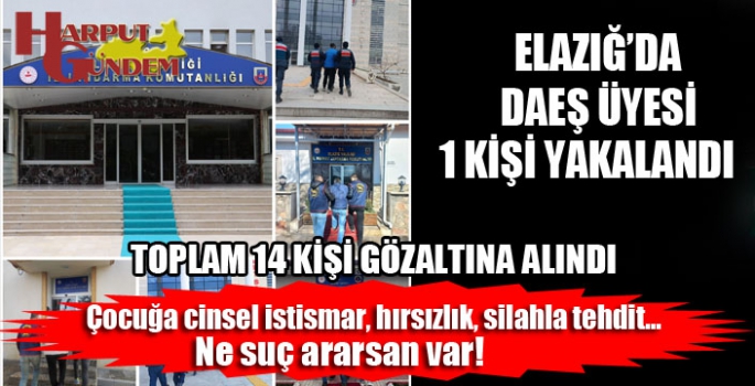 Harput Gündem/Elazığ - Elazığ İl Jandarma Komutanlığı ekiplerince düzenlenen operasyonlarda terör örgütü DEAŞ üyesi olan bir şahıs ile haklarında kesinleşmiş hapis cezaları bulunan 14 kişi yakalandı.